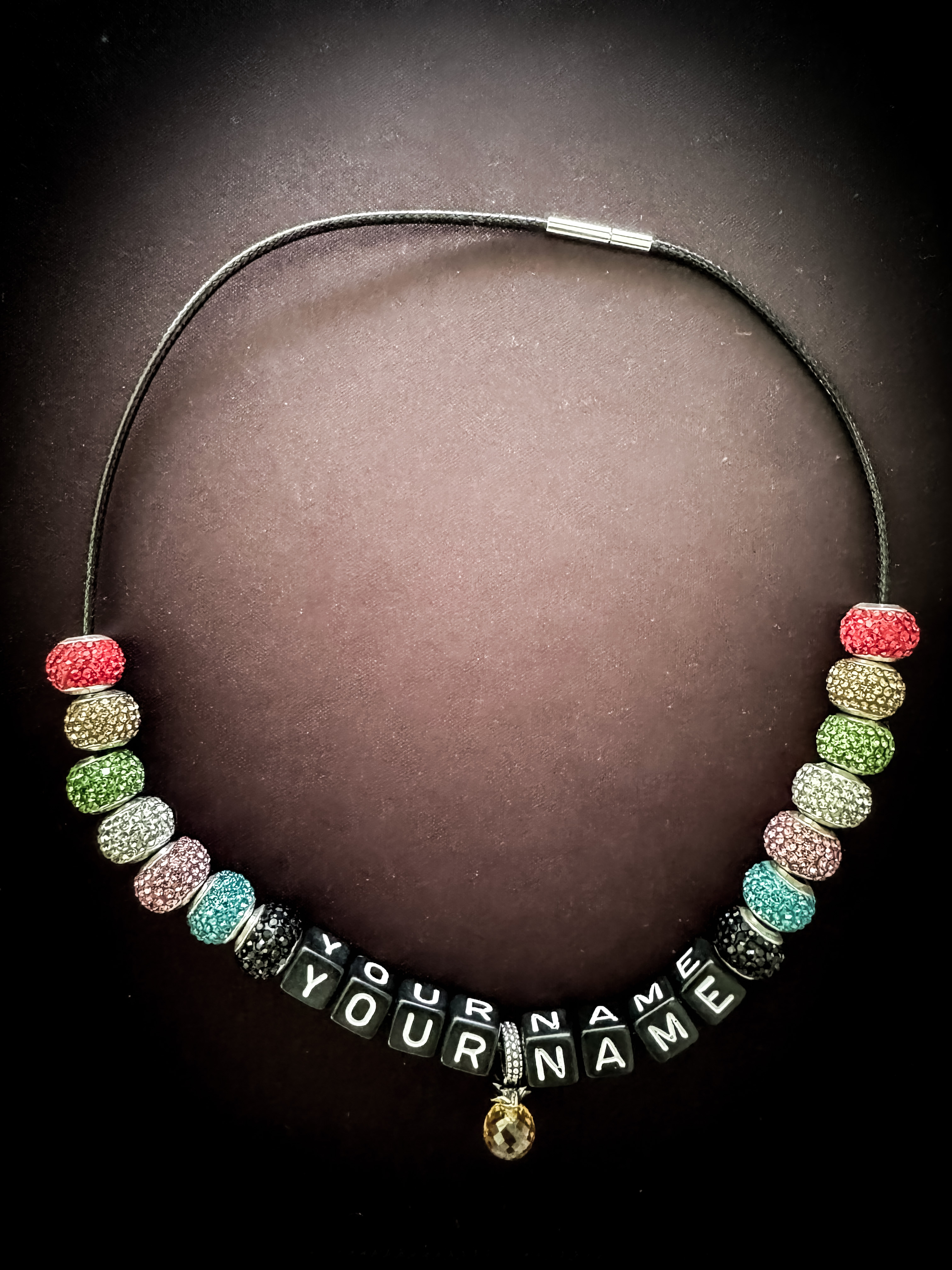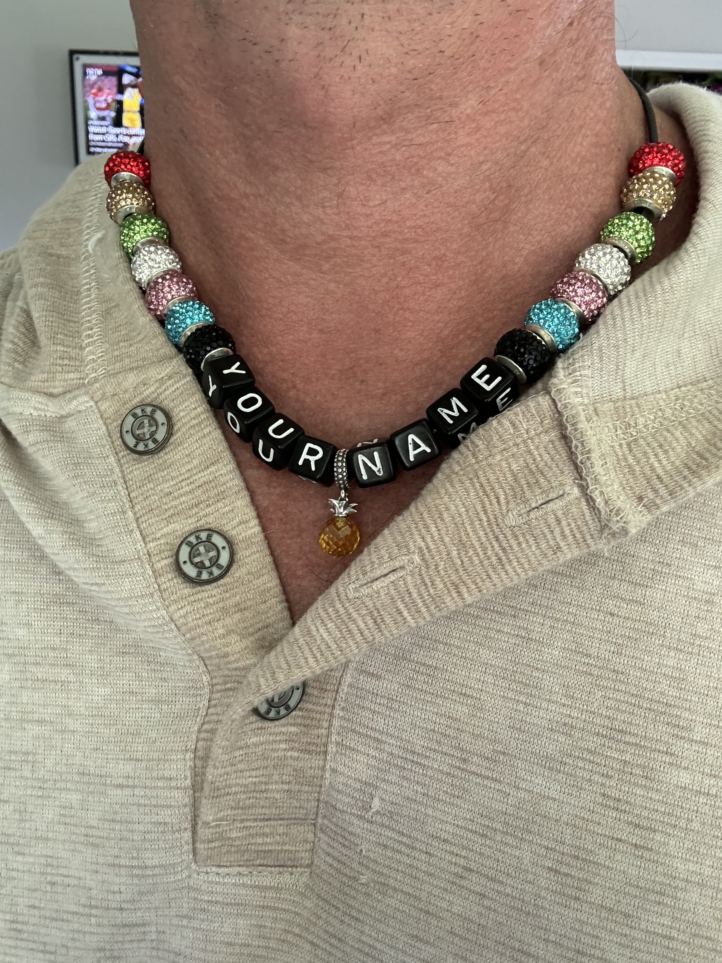 For just $50.00, you'll receive two necklaces—one for her and one for him—each personalized with the names provided on your purchase order. These elegant pieces include all the colored beads and a distinctive pineapple gem. Pick up your necklaces at the door check-in when you receive your event wristbands. Be sure to inform the check-in attendant that you ordered a necklace with your event entry.