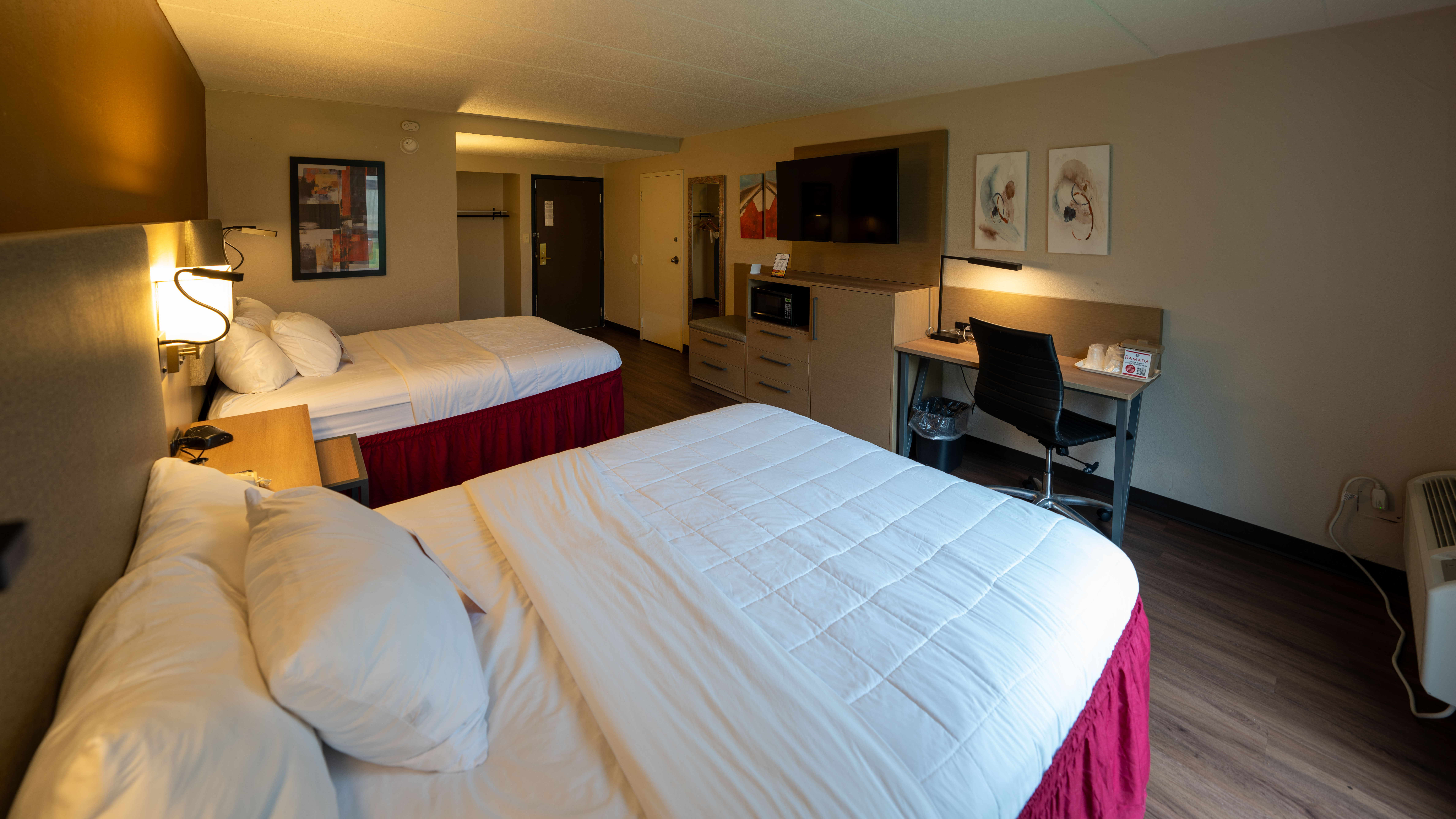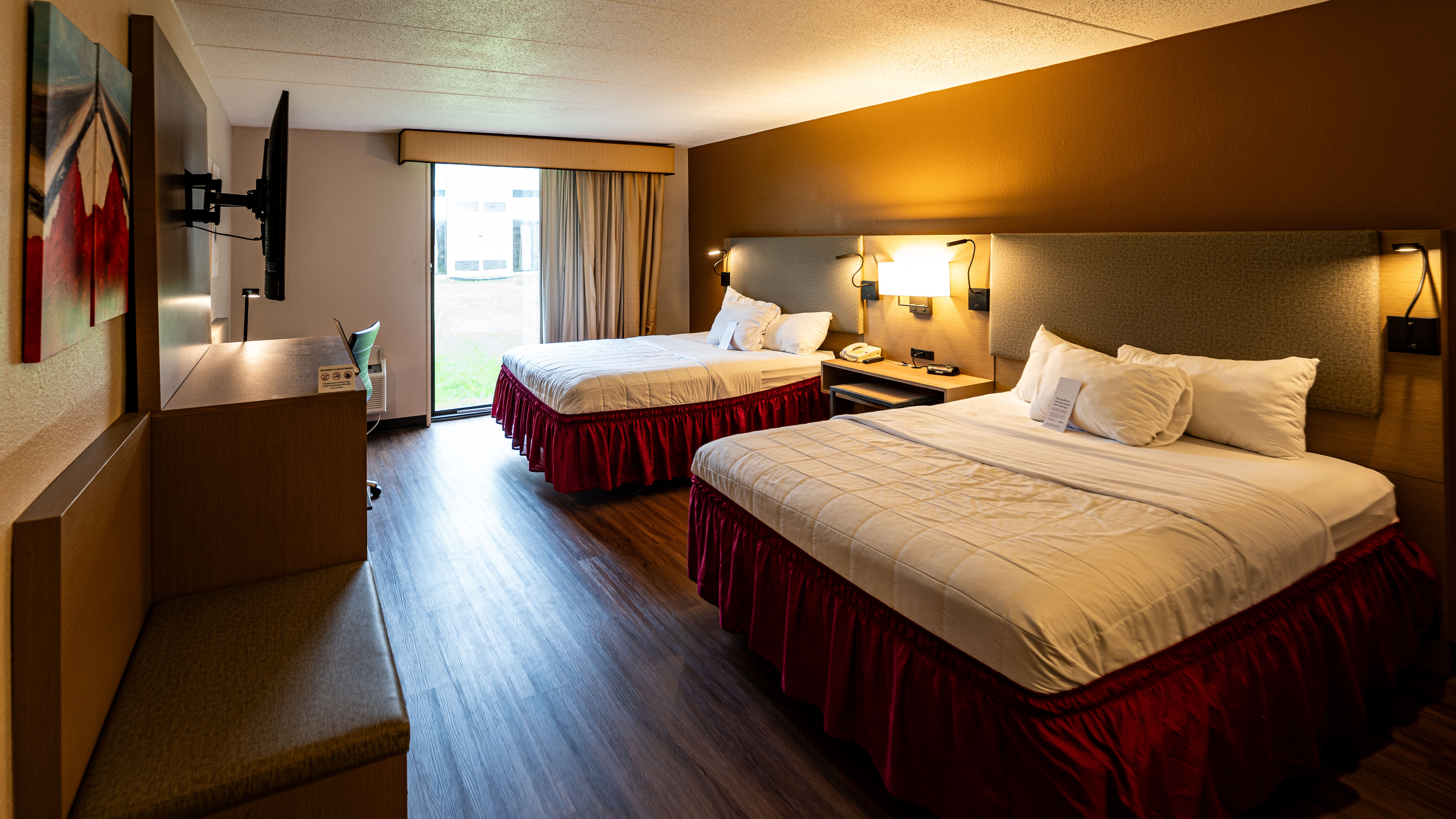 The NQQ2 Double Queen Room provides a practical and comfortable option for guests seeking a quiet, budget-friendly retreat. Each room includes two comfortable 🛏️ queen beds, carpeted floors, and standard amenities for a cozy stay between event activities.