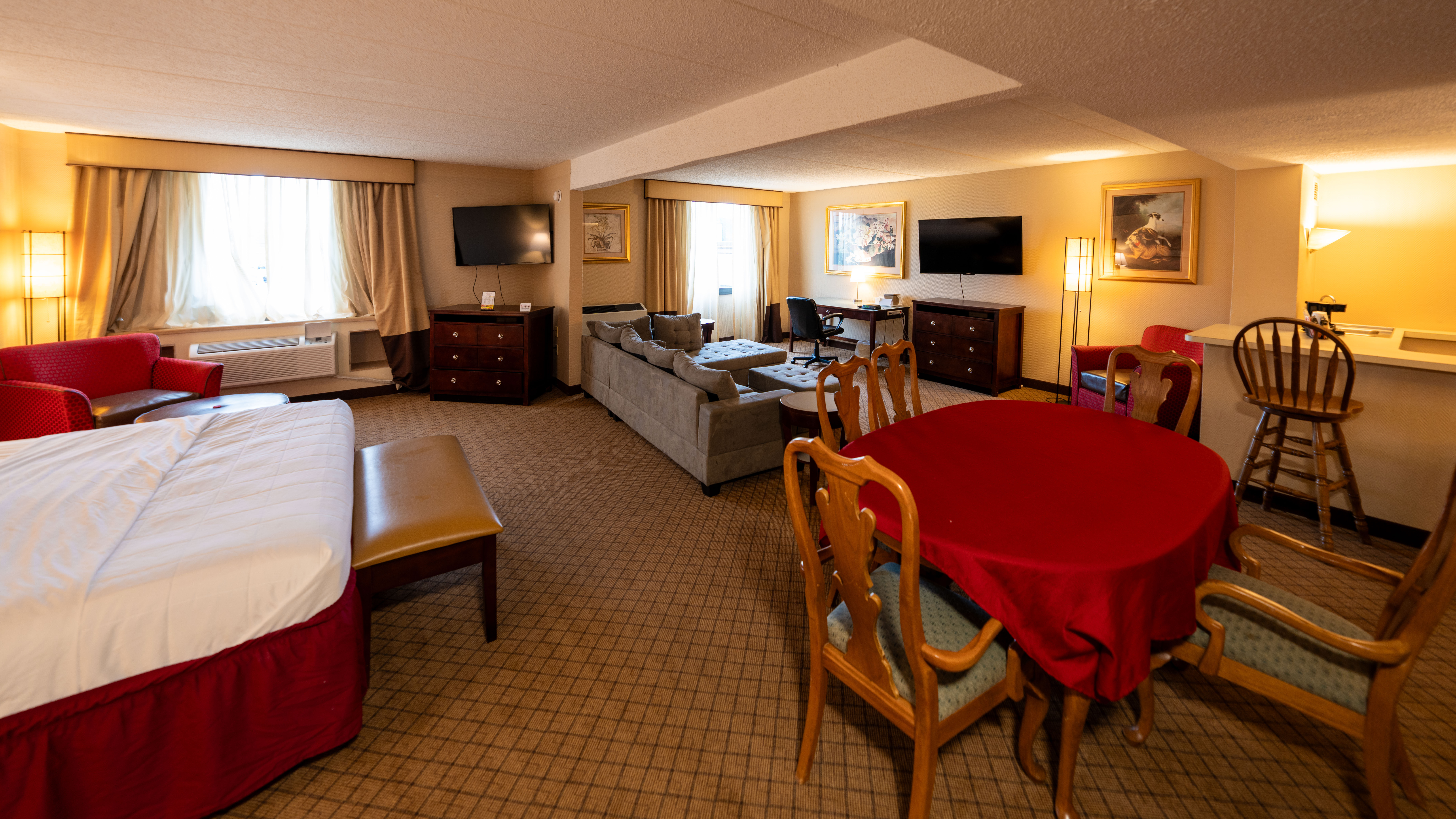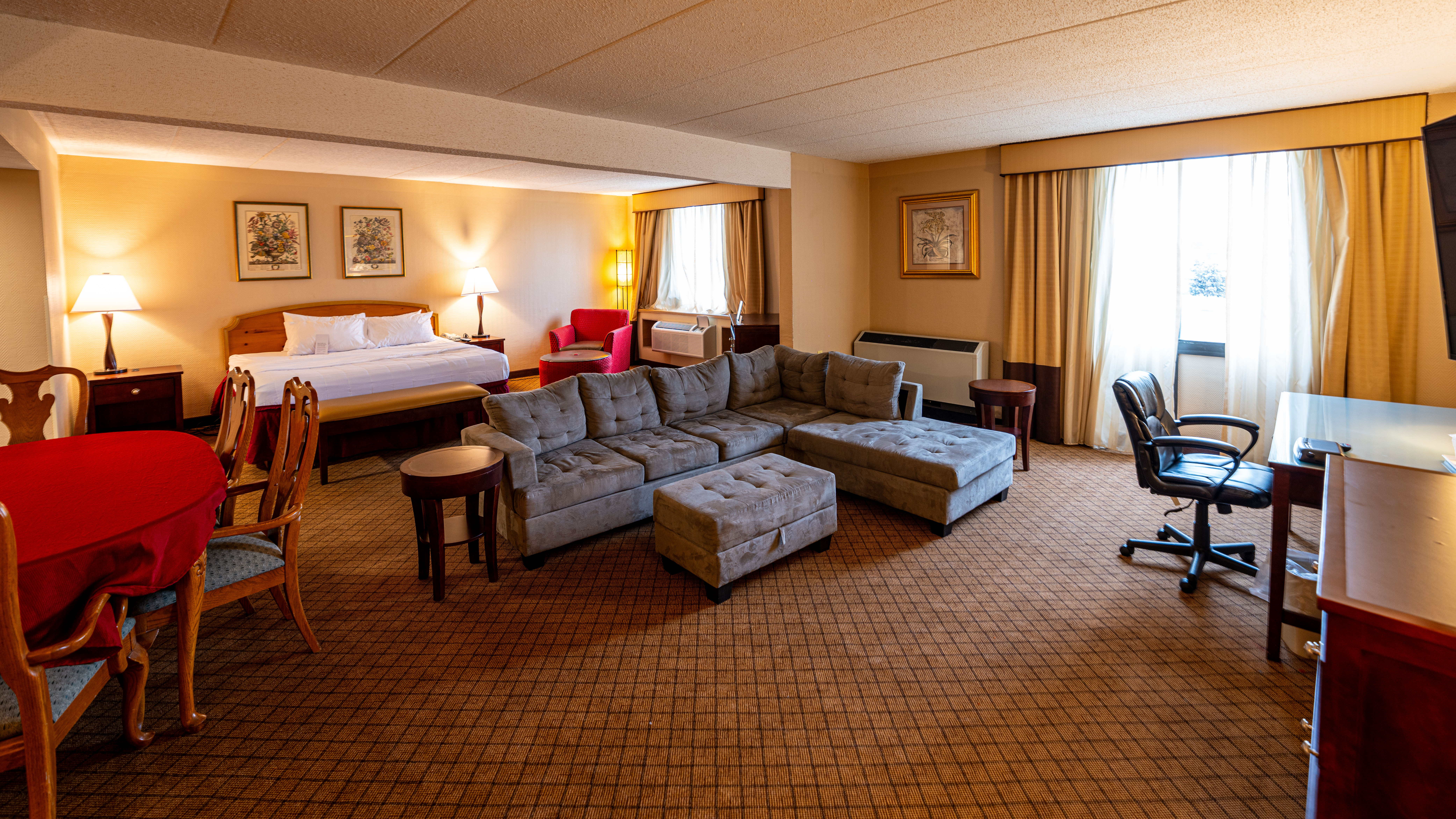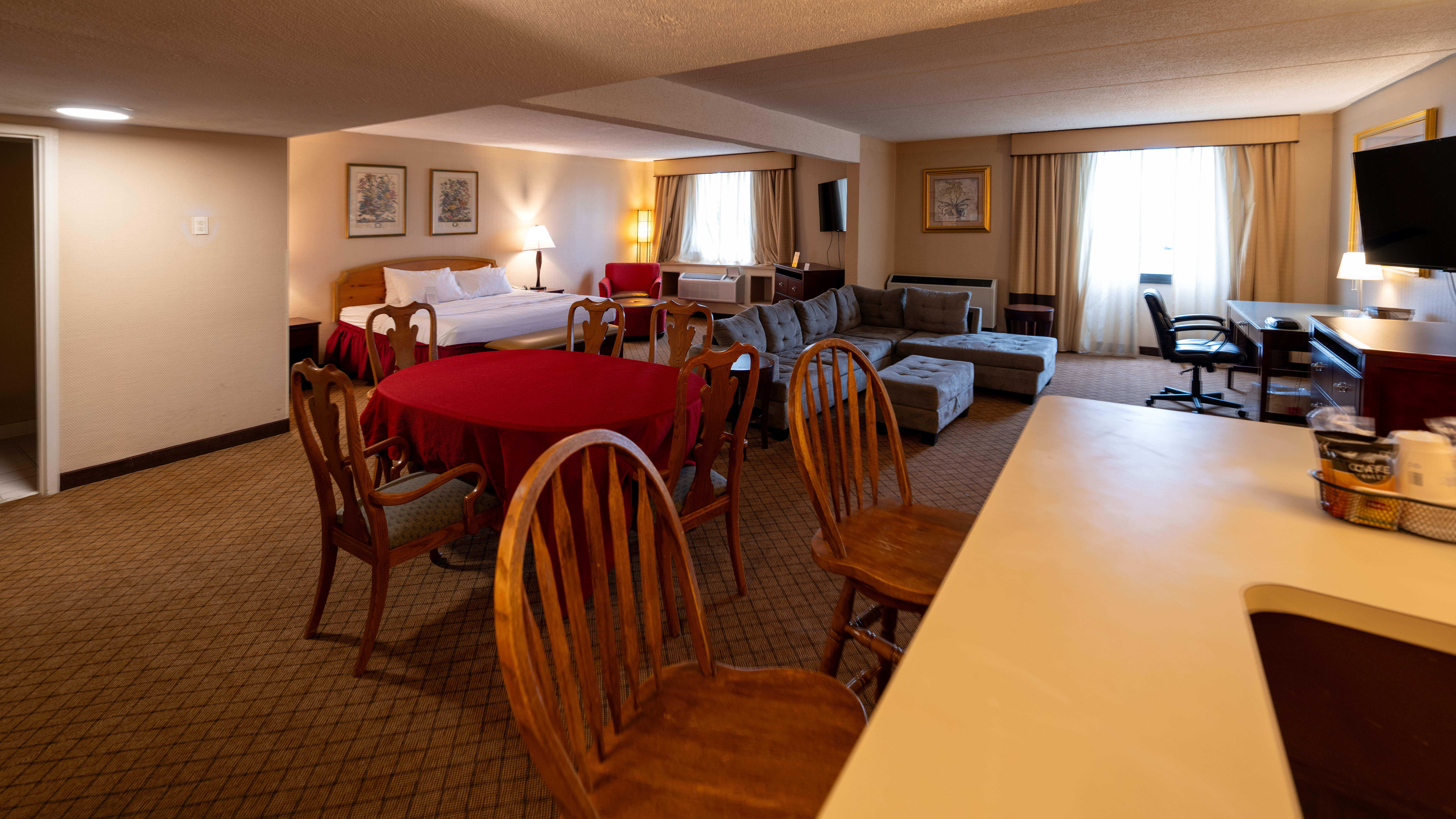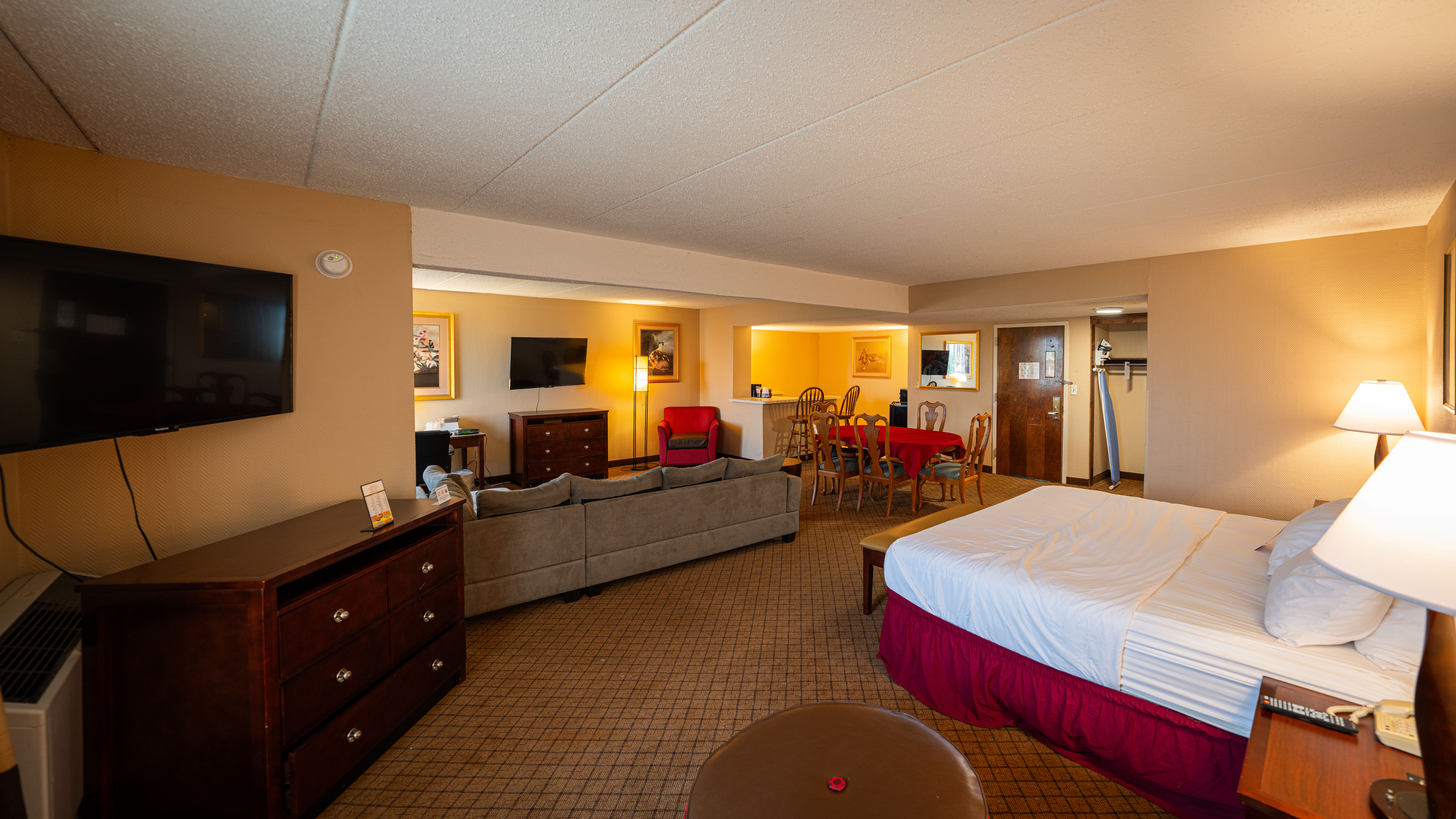The SNK2 Studio King Suite is designed for couples who want extra room to mingle and unwind. Enjoy a spacious open layout with a comfortable 🛏️ king bed, 🛋️ sitting area with couch, and a convenient 🍸 wet bar / kitchen nook (mini-fridge, microwave, coffee/tea). A 🍽️ dining table offers additional seating for socializing between events.
